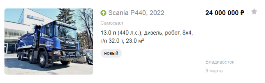 Например, производитель грузовых автомобилей с одной продажи может получить 24 млн рублей, продав всего 1 самосвал Scania P440 2022 года выпуска.