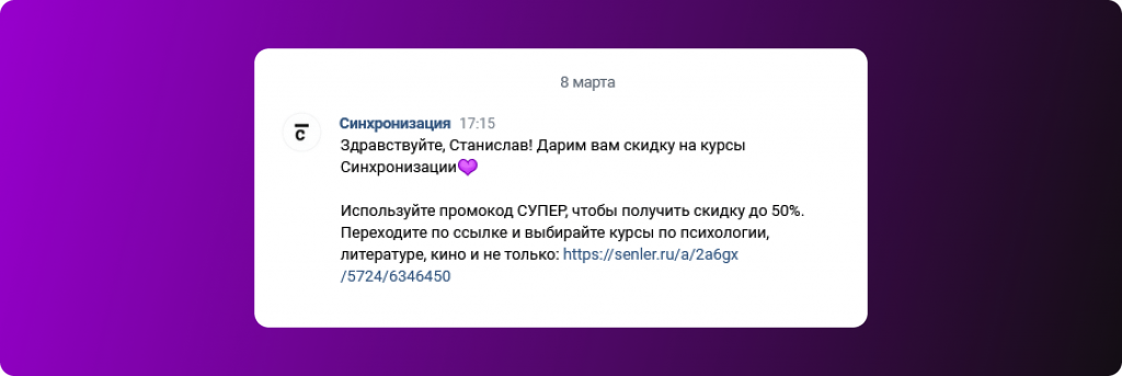 Рассылки в этой соцсети, как правило, вовлекают своих подписчиков в коммуникацию с брендом. В чаты с пользователями присылают новости компании, полезные статьи, рассказывают об интересных акциях, собирают обратную связь и отзывы. Клиенты, у которых спрашивают мнение, становятся лояльнее к компании и её предложениям.